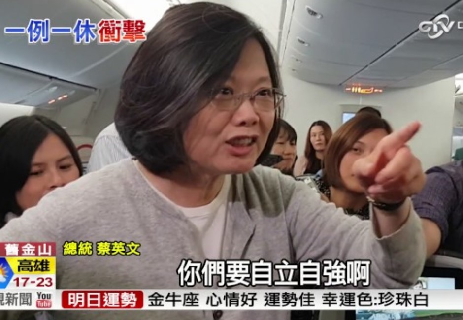 Tsai Ing-wen pointing her finger while speaking, with news broadcast subtitles at the bottom.